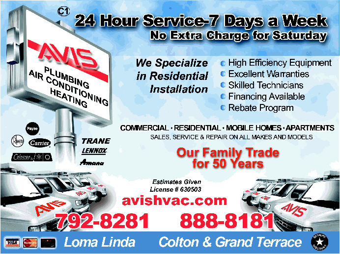 A AVIS PLUMBING HEATING  & AIR CONDITIONING  730 South H St   San Bernardino  888-8181